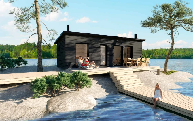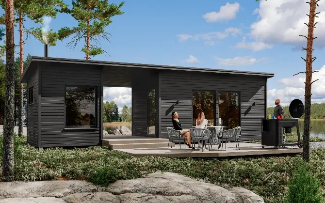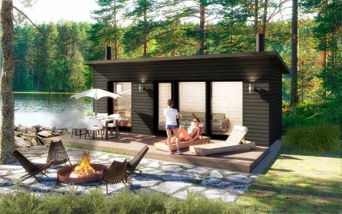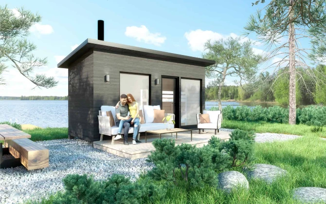 Käytännöllinen ja moderni M-mallin saunamökki tarjoaa käytännöllisyyttä ja luksusta edulliseen hintaan.