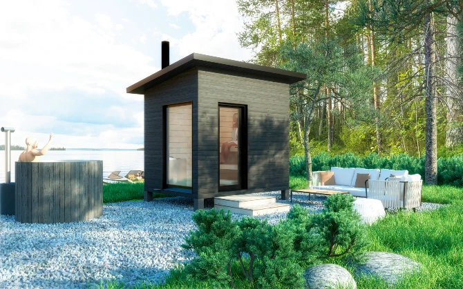 Kompakti ja tyylikäs S-mallin saunamökki tarjoaa täydellisen saunaelämyksen pienessä paketissa.