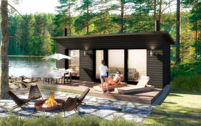– Eristys: Joko 70mm Finnfoam ympäriinsä, tai ainoastaan lattiaan Finnfoamia, ja muuten tuulensuojalevyä 12mm -> kivivilla -> höyrynsulkupaperi. Suosimme kotimaista kierrätysmateriaaleista valmistettua finnfoamia hyvän lämmöneristävyyden takia. – HUOM. Saatavilla myös ekologinen ekovilla eristys lisähintaan + 2 500 € – Harvia 20 Pro RS – kiuas, jossa 30- litran lämminvesisäiliö, sekä piippu. – Lauteet lämpökäsitelty haapa, ja saunapanelointi lämpökäsiteltyä mäntyä. – Puuponttilaudoitus lattioihin. – Sisäverhouspanelointi. – Sähköistys: Pistorasiat, pihavalaistus, kattovalaisinpistoke, ledvalaistus saunassa, PAX – automaattinen tuuletin poistamaan kosteuden. – Ulkoverhous. – Väliovi lasia. – Maisemaikkunat ja ulko-ovet 1-2 kpl riippuen mallista. – Lattiakouru saunassa, 110mm lähdöllä. – Lukkosauma peltikate 0.6mm, mustana.
