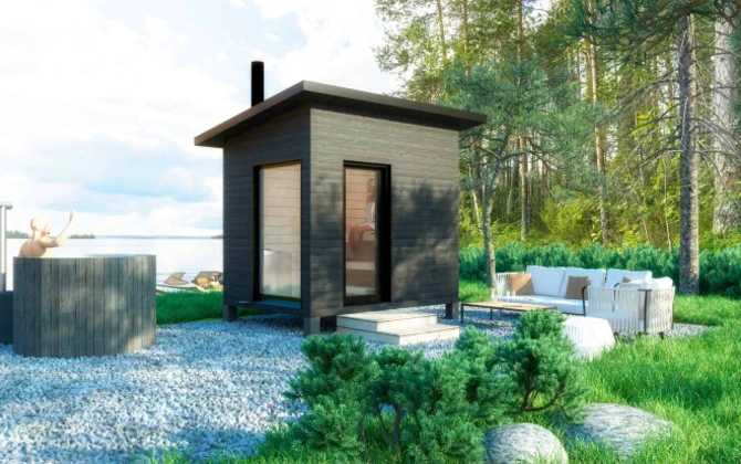 Kompakti ja tyylikäs S-mallin saunamökki tarjoaa täydellisen saunaelämyksen pienessä paketissa.